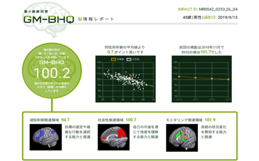 ご参加いただいた方にはMRIによって撮像したBHQレポート(MRI を用いた脳計測による「脳の健康状態 」の分析指標)をお渡しいたします。