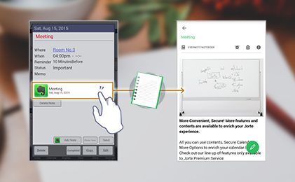 Con Jorte Premium, puede adjuntar múltiples notas de Evernote a un evento en Jorte y así gestionarlos fácilmente al añadir notas sobre sus contenidos. *Requiere la aplicación Evernote.