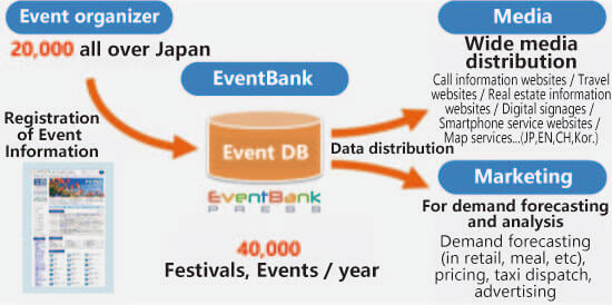 บริษัทในเครือข่ายของเรา บริษัท Event Bank มีข้อมูลงานอีเวนท์ งานเทศกาลทั่วประเทศญี่ปุ่น ตลอดทั้งปีซึ่งมีมากถึง 40,000 งาน และอัพเดททุกๆ วัน มีบริการให้เลือกมากมาย เช่น เว็บไซต์ข้อมูล สถานที่เที่ยว เว็บแหล่งท่องเที่ยว ข้อมูลที่มีประโยชน์ของแต่ละภาค แอพพลิเคชั่น ข้อมูลต่าง ๆ มีหลายภาษาให้เลือกใช้งาน (ภาษาอังกฤษ ภาษาจีน ภาษาเกาหลี) ใช้ข้อมูลกับเป้าหมายนักท่องเที่ยวชาวต่างชาติได้ และยังมีบริการวิเคราะห์ข้อมูลจำนวนคน วันเวลา สถานที่ต่างๆ ซึ่งเป็นข้อมูลสำคัญในการตลาดได้