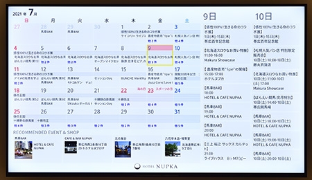 With the large-scale renovation of a 6-story office building owned by Dai-ichi Life Insurance Co., Ltd. near Obihiro Station, Obihiro City, Dai-ichi Life Insurance Co., Ltd., and Tokachi City Design Co., Ltd. "NUPKA Hanare" was born under the "Collaboration Agreement". You can see the "Event Calendar" utilizing Jorte's system on large TV screens in guest rooms. We will enhance the attraction and experience of attracting customers to Obihiro Town (Hokkaido, Japan).