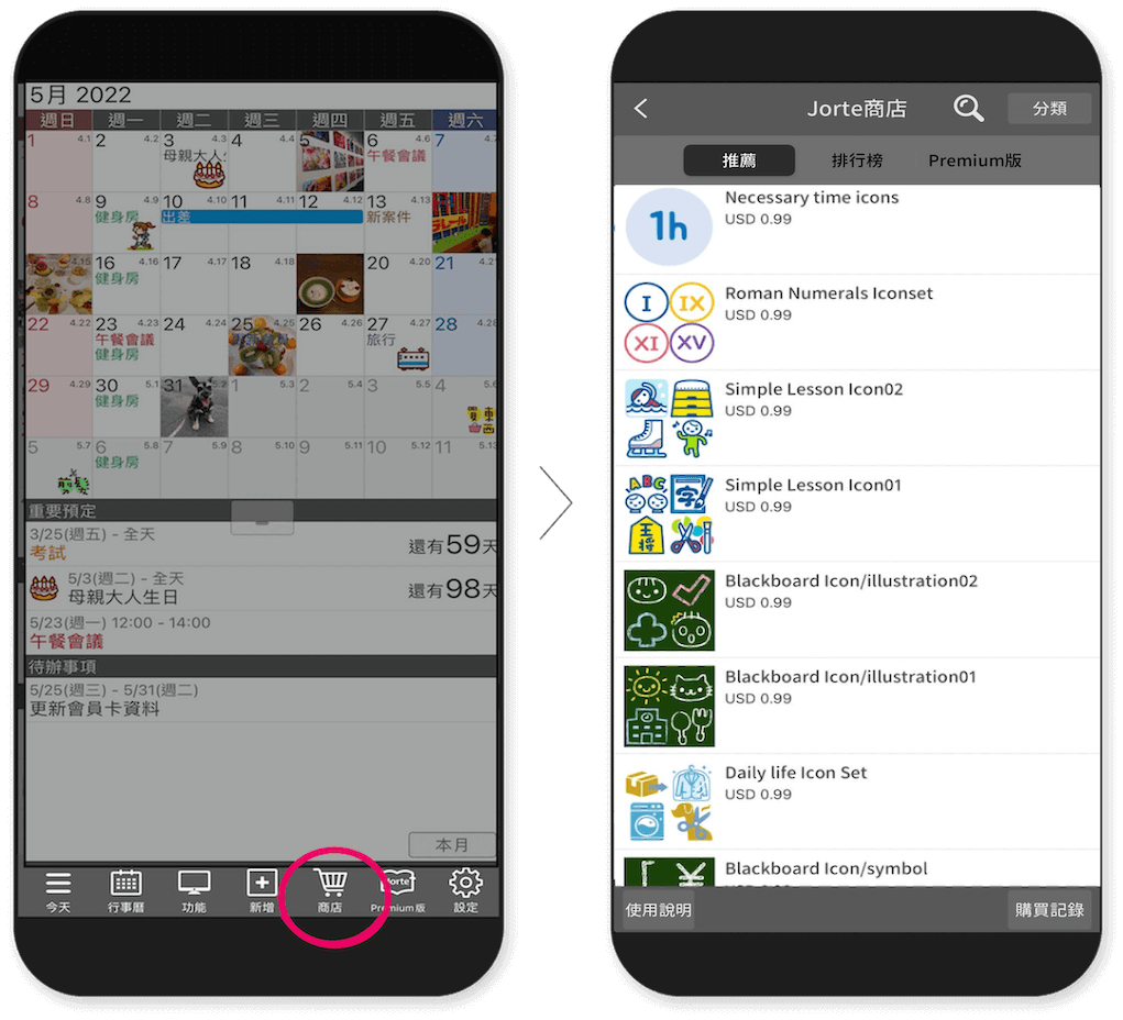儲存在Jorte的行程保持不變,背景圖片、圖示、字型、選單、活動行事曆等,皆可根據個人喜好改變,這就是Jorte的「主題」功能。有超人氣卡通偶像、時尚設計等主題,購買後就可將Jorte大變身。