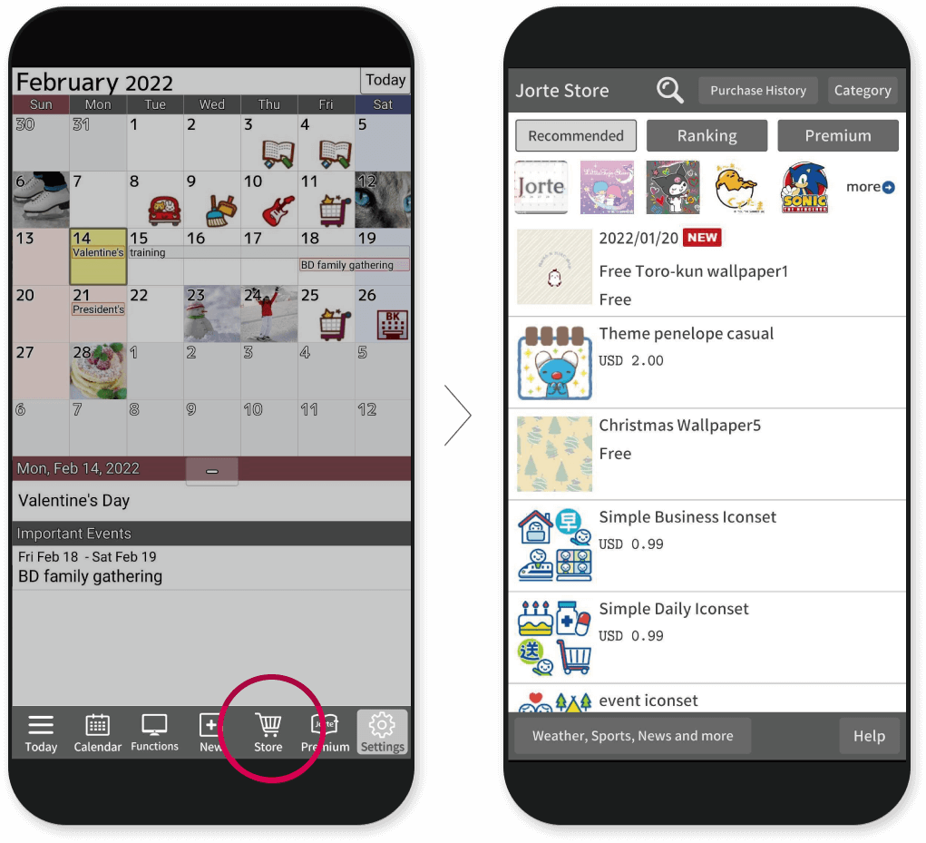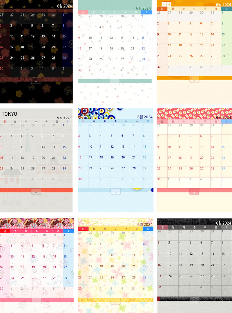 조르테에 저장되어 있는 당신의 일정은 그대로 배경화면과 아이콘, 글꼴, 메뉴, 이벤트캘린더 등 모든항목이 당신의 취향으로 변신합니다. 그것이 바로 조르테만의 기능 「테마스킨」입니다. 인기 캐릭터와 스포츠팀, 세련된 디자인 등 테마스킨을 적용하면 모든 항목과 디자인이 순식간에 변신합니다.
