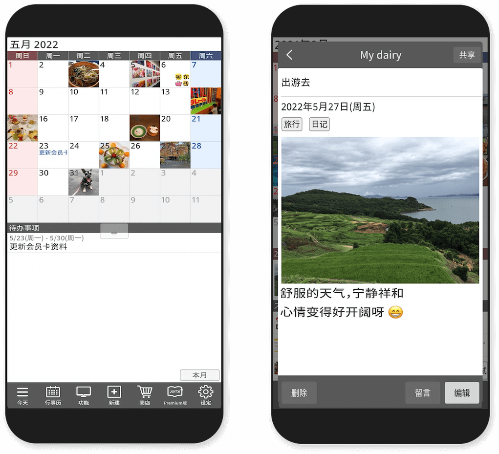 每天的记录或工作笔记等可用文字及照片做记录。不仅是日程计划,还有日记、照片、日常记录、工作笔记等皆可在Jorte上简单运用。添加的照片可以在日历上显示,而且还可以通过添加标注轻松整理多个日记。不仅是未来的活动安排,还是过去的经历和活动,皆可通过Jorte保管您珍贵的回忆及照片。