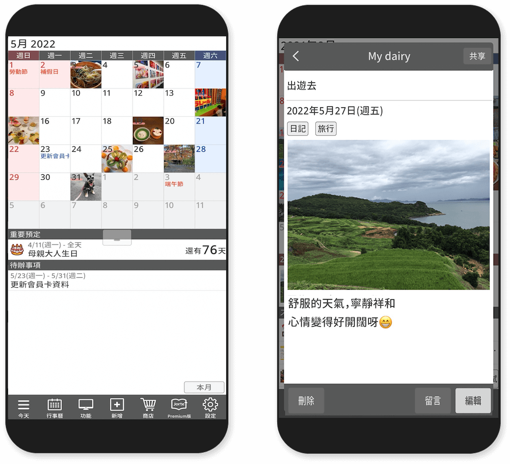 每天的記錄或工作筆記等可用文字及照片做記錄。不僅是行程計畫,還有日記、照片、日常記錄、工作筆記等皆可在Jorte上簡單運用。加入的照片可以在行事曆上顯示,而且還可以透過加入標註輕鬆整理多個日記。不僅是未來的活動安排,還是過去的經歷和活動,皆可透過Jorte保管您珍貴的回憶及照片。