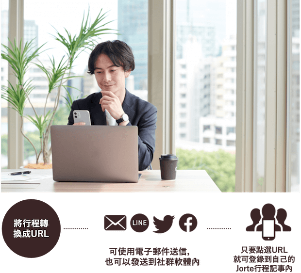 可以將自己輸入的行程轉換成URL發送給家人、朋友、公司同事等。不論是商務還是個人行程中皆可活用。