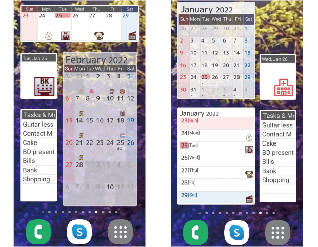 可在安卓手機的主畫面上使用Widge小工具功能顯示Jorte行事曆。Jorte提供了25種不同的小工具尺寸,不論是尺寸還是要顯示的內容皆可詳細設定。手機的主畫面上有Jorte,就可以隨時確認及輸入行程,非常方便。