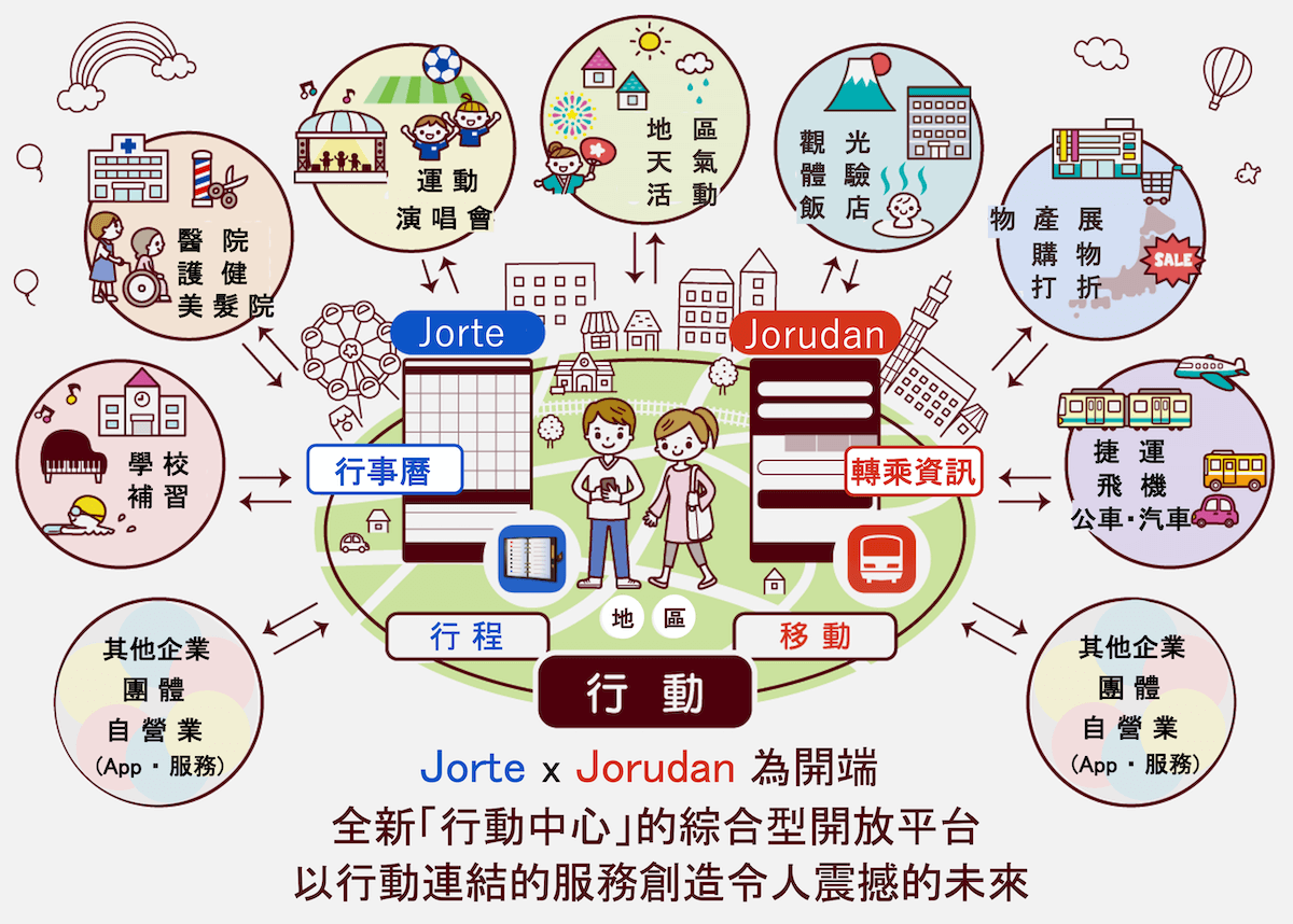 發展MaaS (Metal as a Service)業務的Jorudan Co., Ltd.(總部:東京都新宿區,CEO:佐藤 俊和Toshikazu Sato,以下簡稱Jorudan)和發展行事曆服務Jorte Co., Ltd.(總部:東京港區,CEO : 下花 剛一Goichi Shimohana,以下簡稱Jorte ) 於2021年2月17日開始透過對各自平台的整合,來構建「行動為中心」的綜合型服務平台。兩家公司以「開創將行動賦予活力的感動式體驗,將人們與令人震撼的未來世界聯繫起來」做為目標,以任何企業或個人均可自由參與的開放式聯盟作為基礎平台,從而創造出包括數據處理在內的各種商業模式並完善社會基礎。